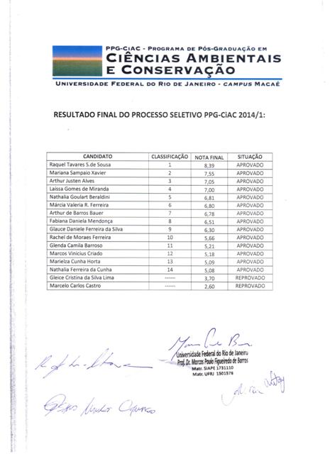 O Professor Rodrigo Nunes da Fonseca, Coordenador do Programa de Pós-Graduação em Ciências Ambientais e Conservação (PPG-CiAC/UFRJ – campus Macaé), faz saber o resultado final do processo seletivo de mestrado 2014:
